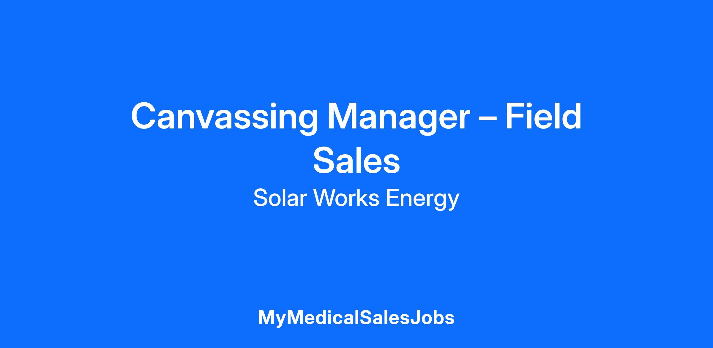 Solar Works Energy<\/b> <\/span>is seeking an experienced and driven <\/span>Canvassing Manager<\/b> <\/span>to lead a high -performing field sales team in residential solar. This is a field -based leadership role requiring a mix of <\/span>door -to -door sales skills, team management, and performance accountability<\/b>.